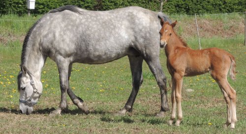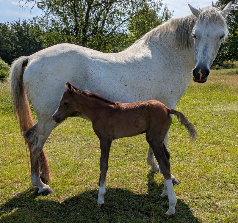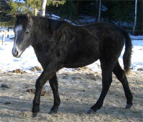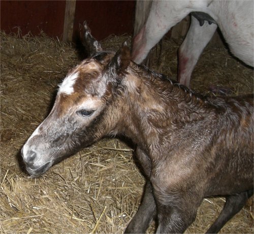 Hon är född fux, men är skimmel, som sina syskon. Hon var stor, pigg och stark när hon föddes. Till vår stora lycka var det ett stoföl och hon ska stanna hos oss och ta över Aktris