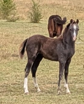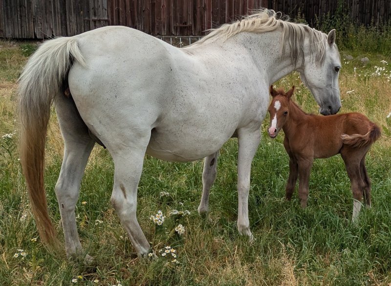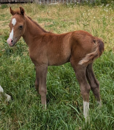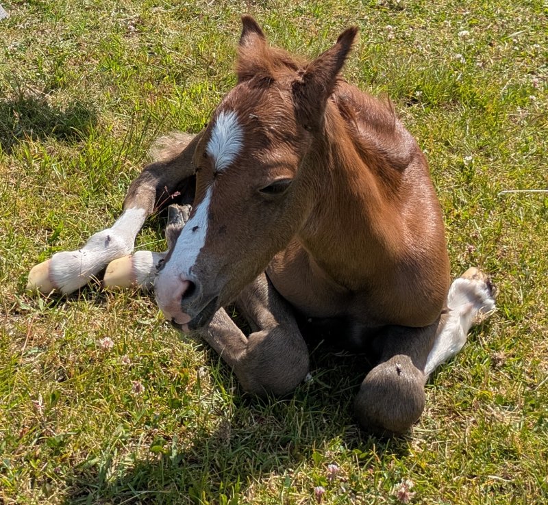 23 juni 2025, tidigt på morgonen, fölade Adwen. 12 timmar efter att Mindy fölade. Till vår stora lycka var det ett stoföl. Hon är skimmel, född fux. Hennes namn är Kardel Apple Blossom.